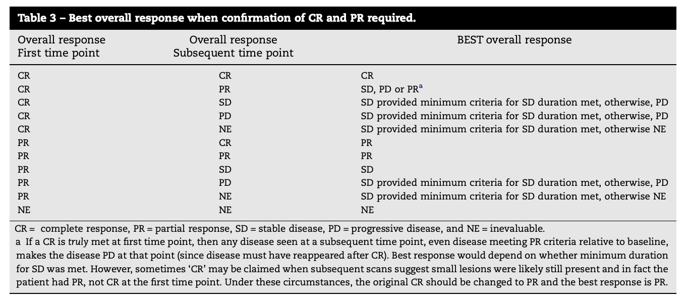 两种缓解(CR/PR)需要能够得到后续访视(时间间隔具体看方案)的疗效确认;